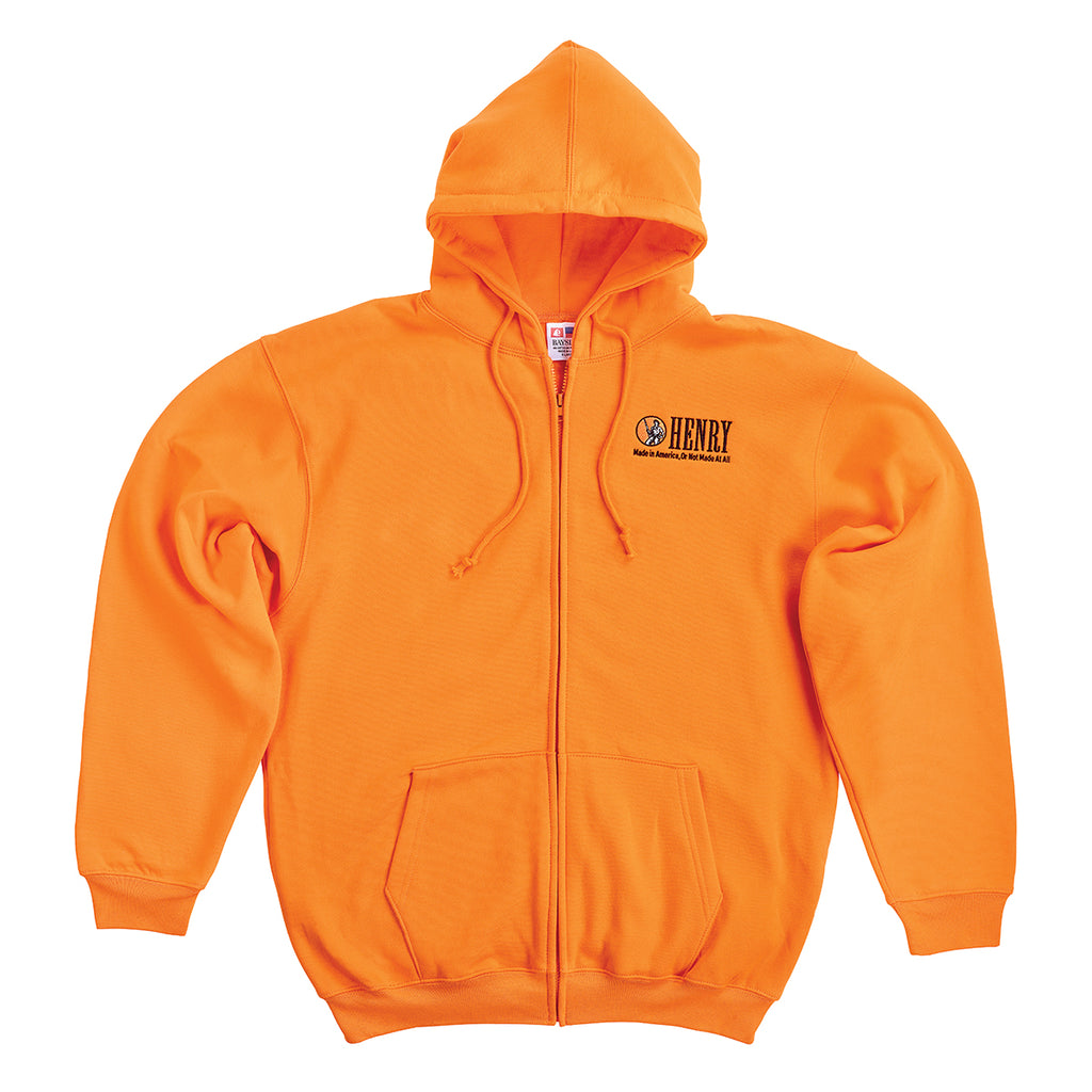 Our zippered hoodie is available in charcoal, bright orange and hunter green.