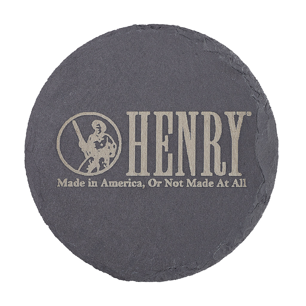 Slate coasters approximately 4 inches in diameter or 4 inches square, laser engraved with Henry logo